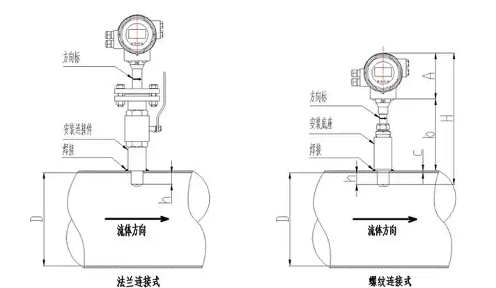 ▲垂直安装,传感器插入管道时应与管道断面的垂直直径夹角小于5°,适用于测量管道振动小的清洁介质。