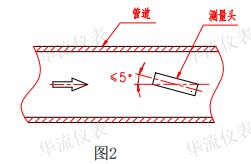 5、测量头上箭头的方向应与流体流动的方向一致。安装时测量头与流体流动方向的夹角不大于 5°(见图2)